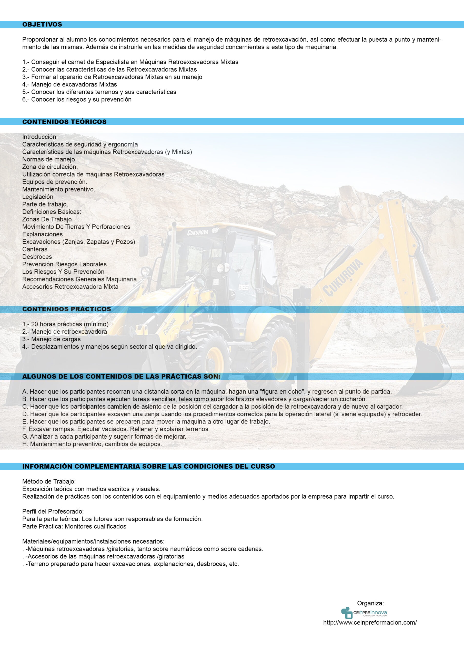 Fase práctica: En esta fase, los alumnos van a realizar diferentes ejercicios prácticos(realización de zanjas, desmontes, vaciados, pozos, taludes, movimientos de tierras, nivelación de terreno, excavaciones, etc), con el fin de asentar y poner en práctica los conocimientos necesarios para poder desarrollar los trabajos con retroexcavadora.